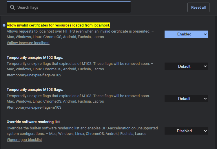 要するに、「chromeの設定でAllow invalid certificates for resources loaded from localhost.」を有効にするだけです。以下に詳細を記載します。
