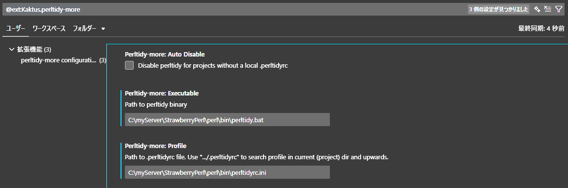 PrettierではPerlに対応してないので、Perlフォーマッタに関する設定を追加する。