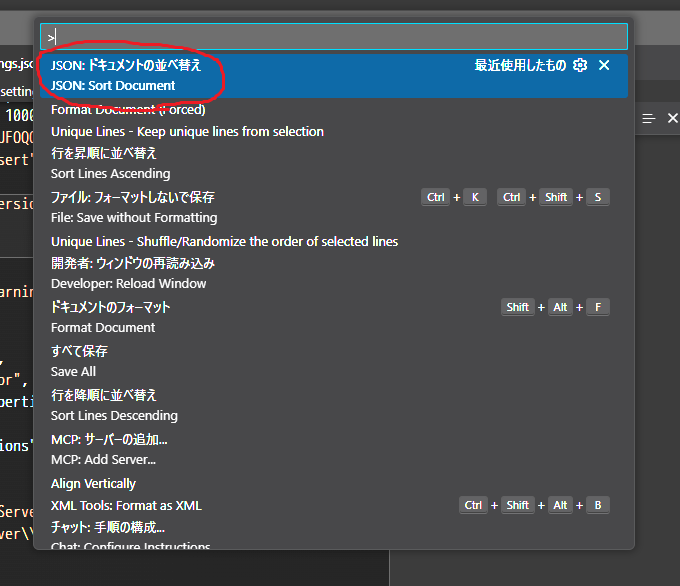 設定ファイルがごちゃごちゃしてきたら「JSON:Sort Document」があるのでスッキリすると思う。