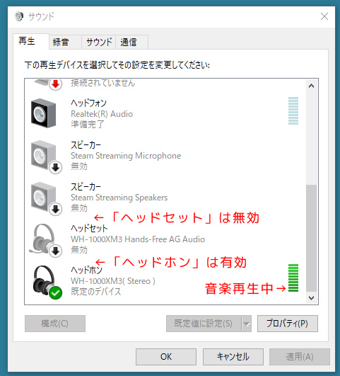 解決方法は、ワイヤレスヘッドホンについて「ヘッドセット」としての認識を無効にして、「ヘッドホン」として機能させることです。以下に具体的な手順を書きます。