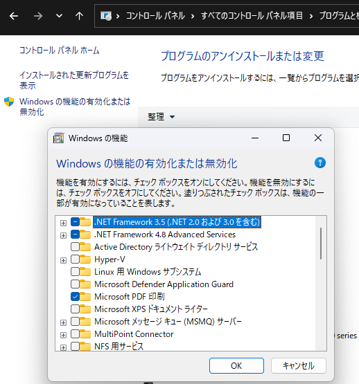 少し前に多かったのがこれ。「コントロールパネル>プログラムと機能>Windowsの機能の有効化または無効化」で: