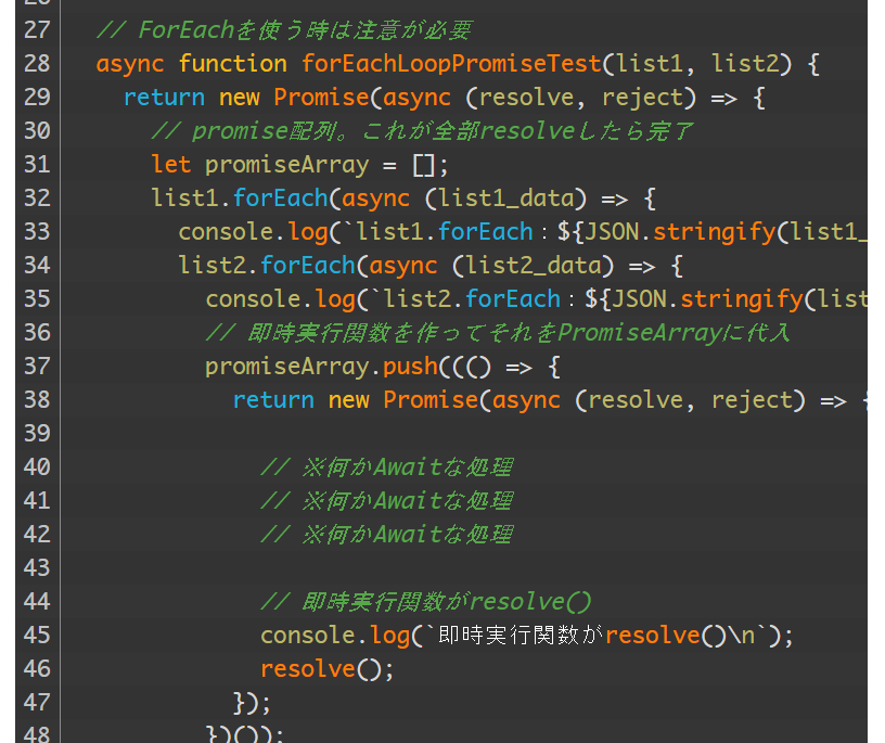 })();これだと、list2.forEachブロック内の処理が全部終わる前に関数「forEachLoopPromiseTest」がresolveしてしまって、「スクリプト完了!」って出た後で「list2.forEachが完了」だの「list1.forEachが完了」が表示されてしまいます。(本来は両方のforEachが完了してから「スクリプト完了!」となる様に実行したい)